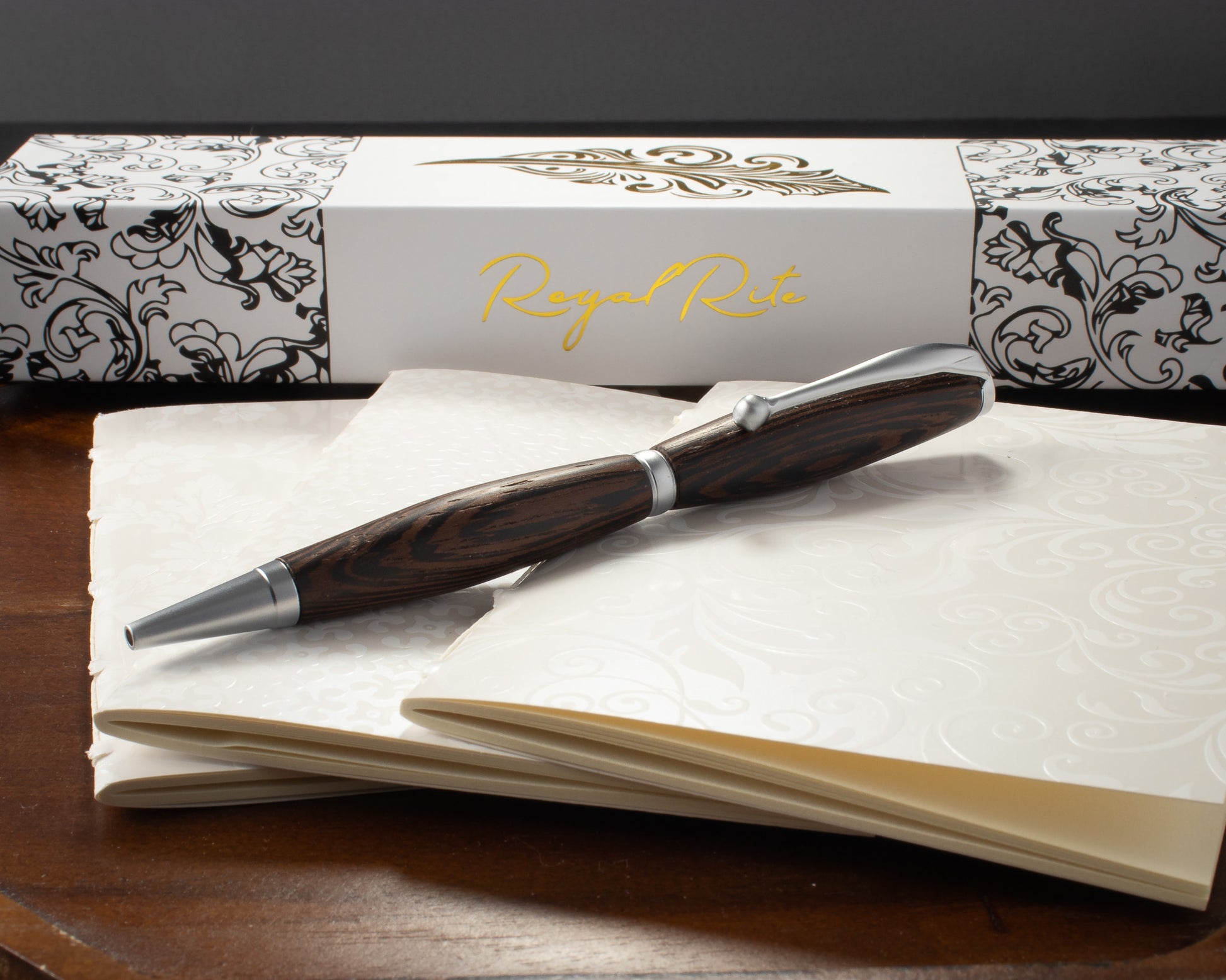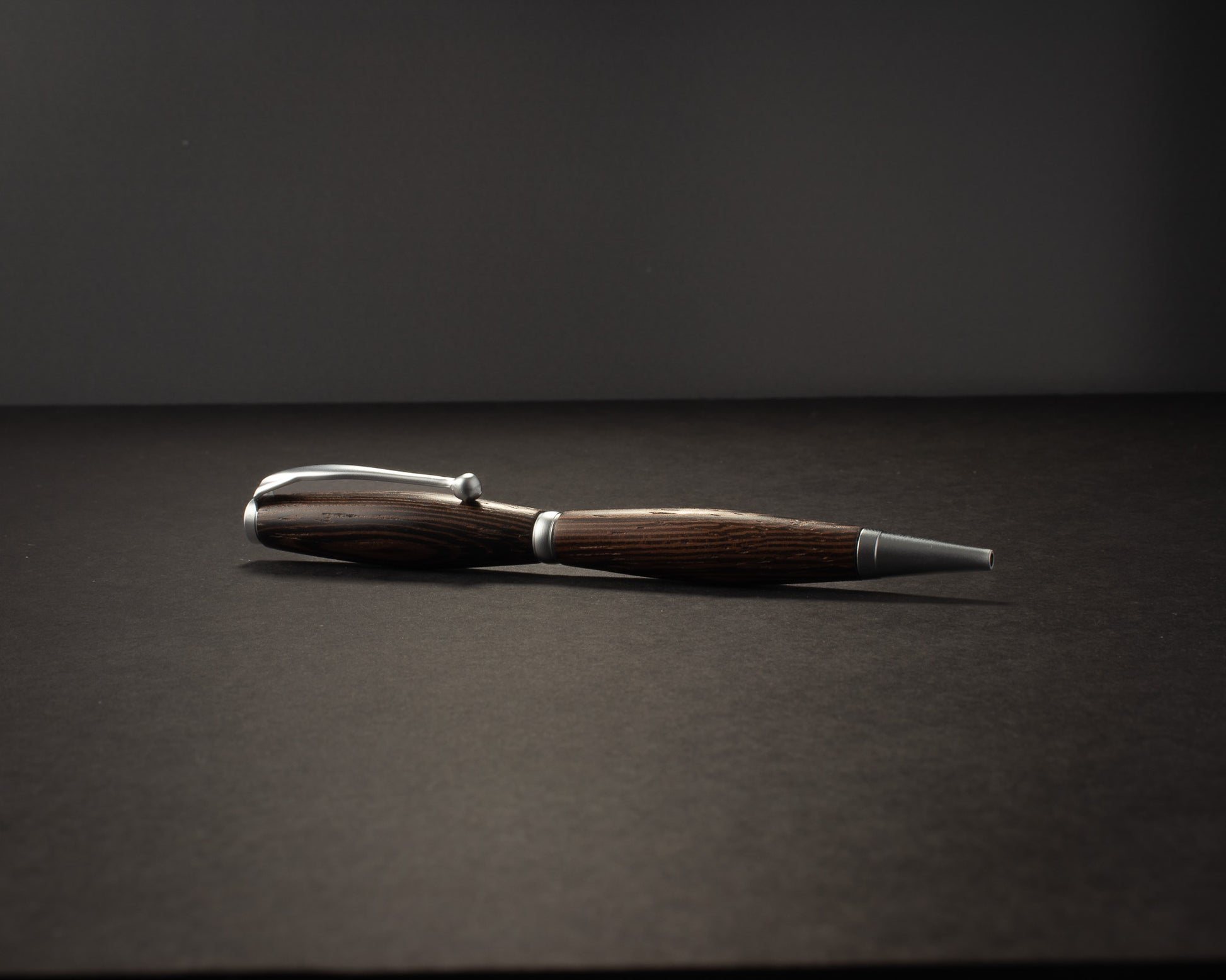 Obsidian Veil captures the dance of shadow and light in its design. Hand-turned from exotic wood with rich espresso and charcoal tones intertwined like secret currents, each stroke reveals its unique grain. Satin chrome hardware provides a subtle contrast, softening the intensity with an elegant touch. More than a pen, it’s a carefully crafted relic that invites you to hold the mystery of darkness layered in motion.