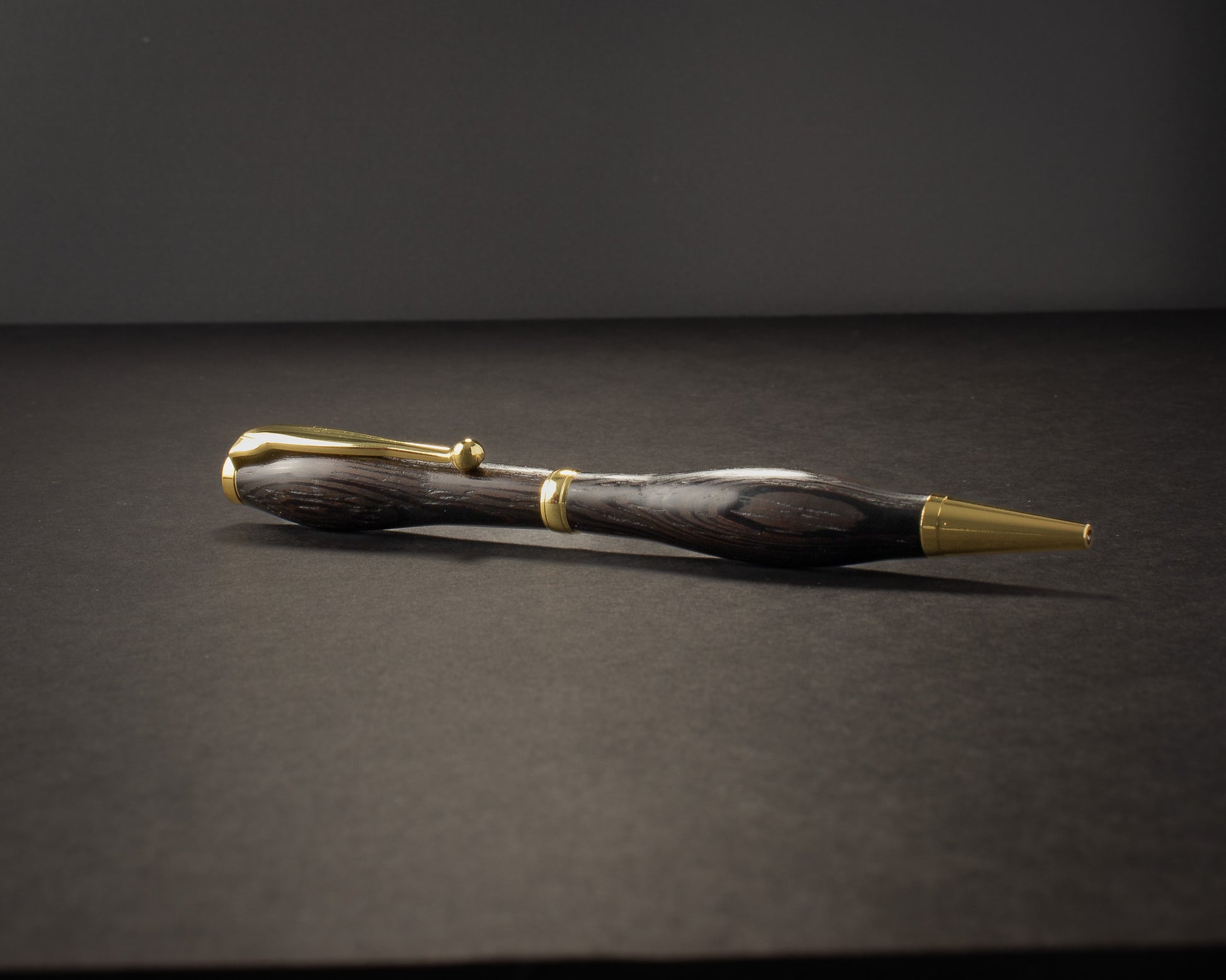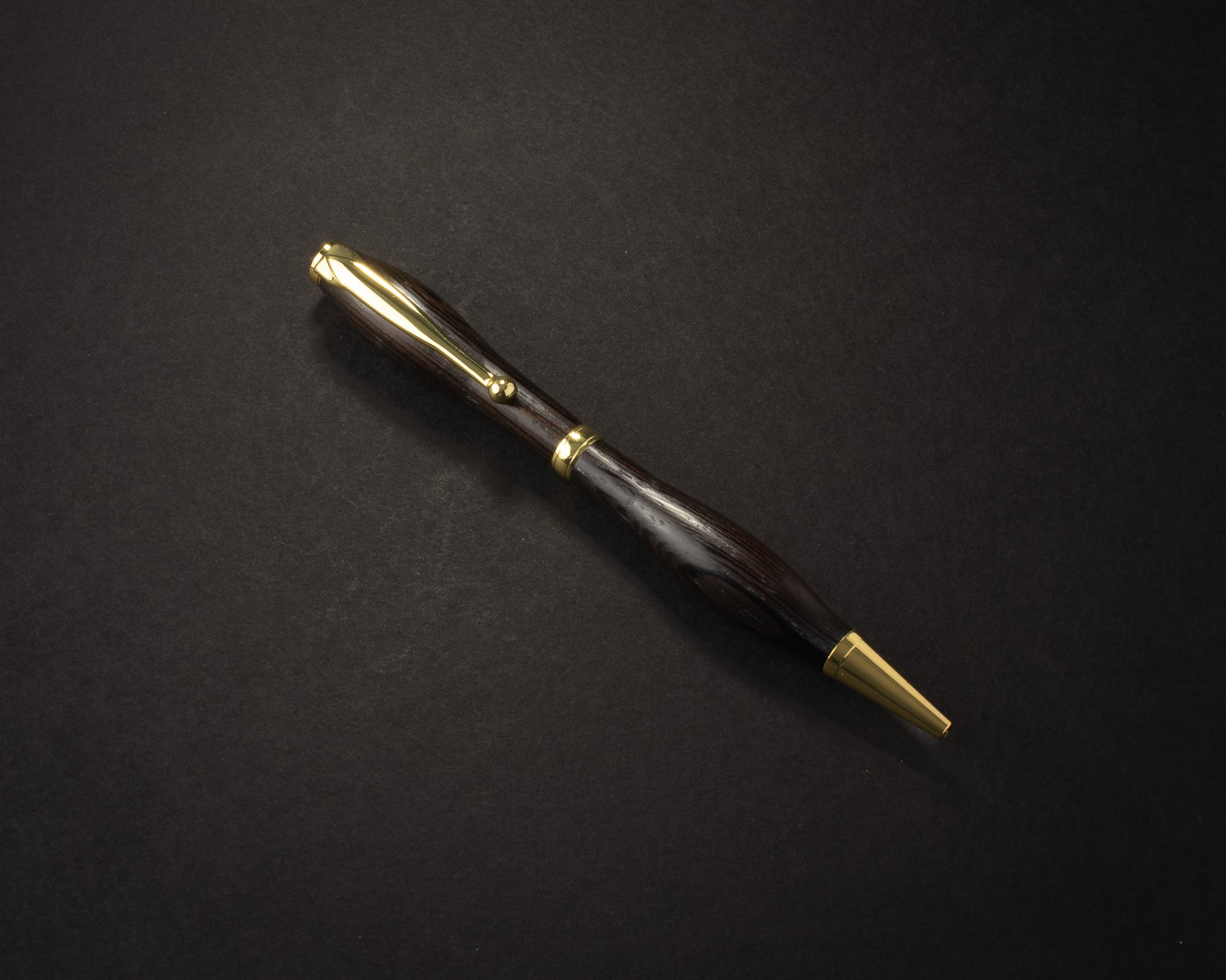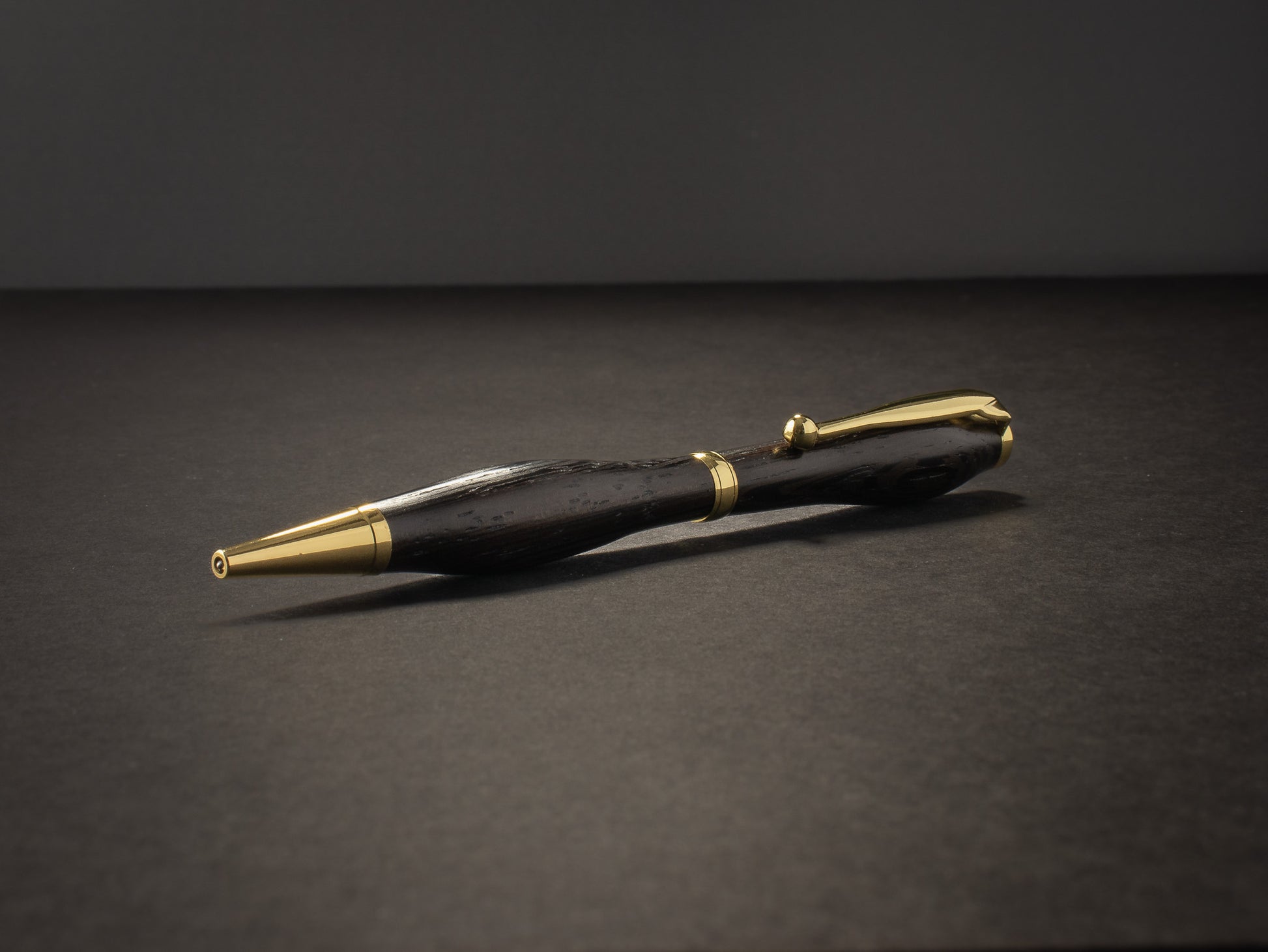 The Nocturne Regent—Slimline, Gold Hardware tells a story of refined elegance. Its deep, dark wood body contrasts beautifully with radiant gold trim, creating a pen that commands attention. Sculpted curves and polished accents invite you to hold a piece that feels both timeless and regal, making every word you write a moment of distinction. This pen is not just a tool, but a statement of presence and craftsmanship.