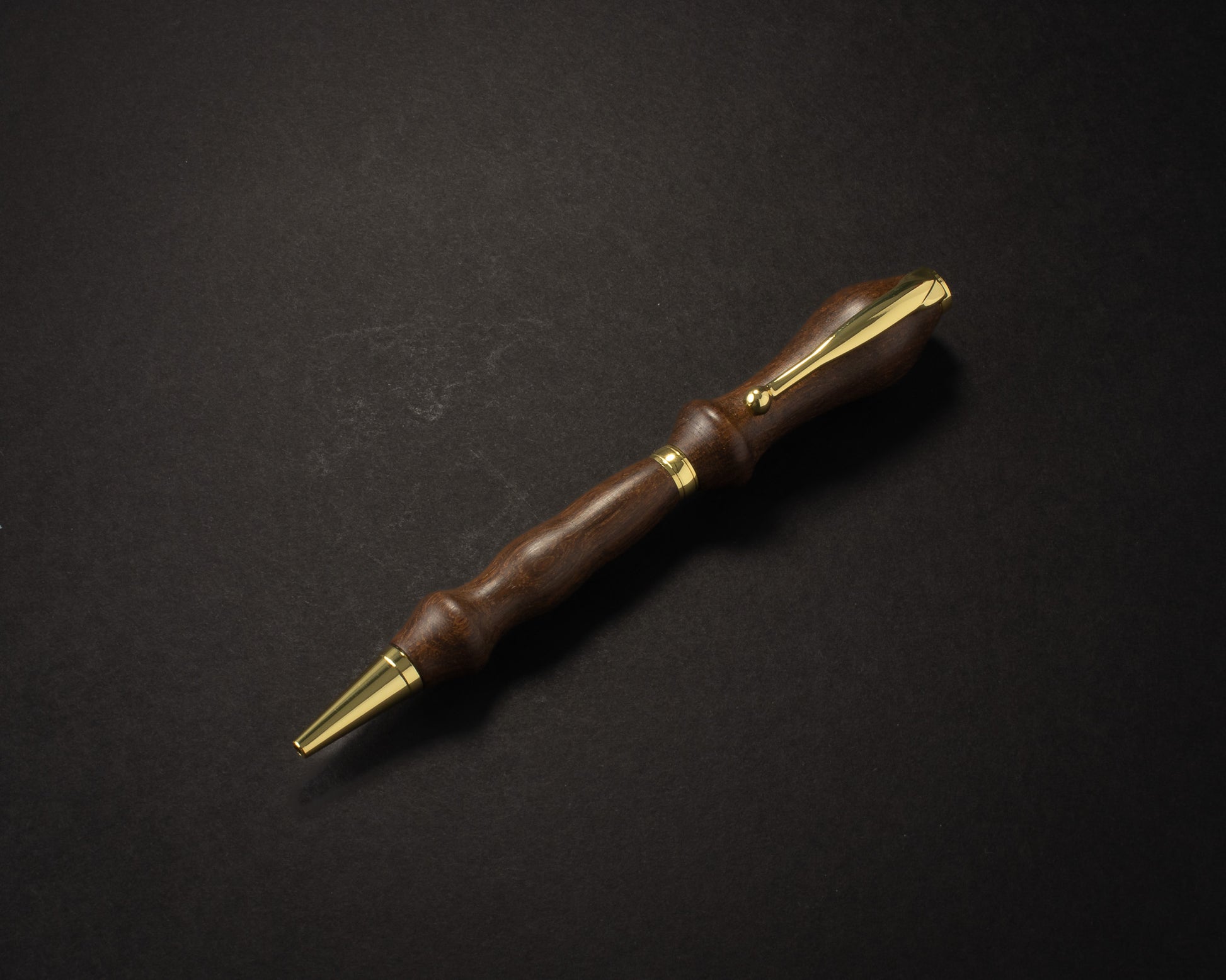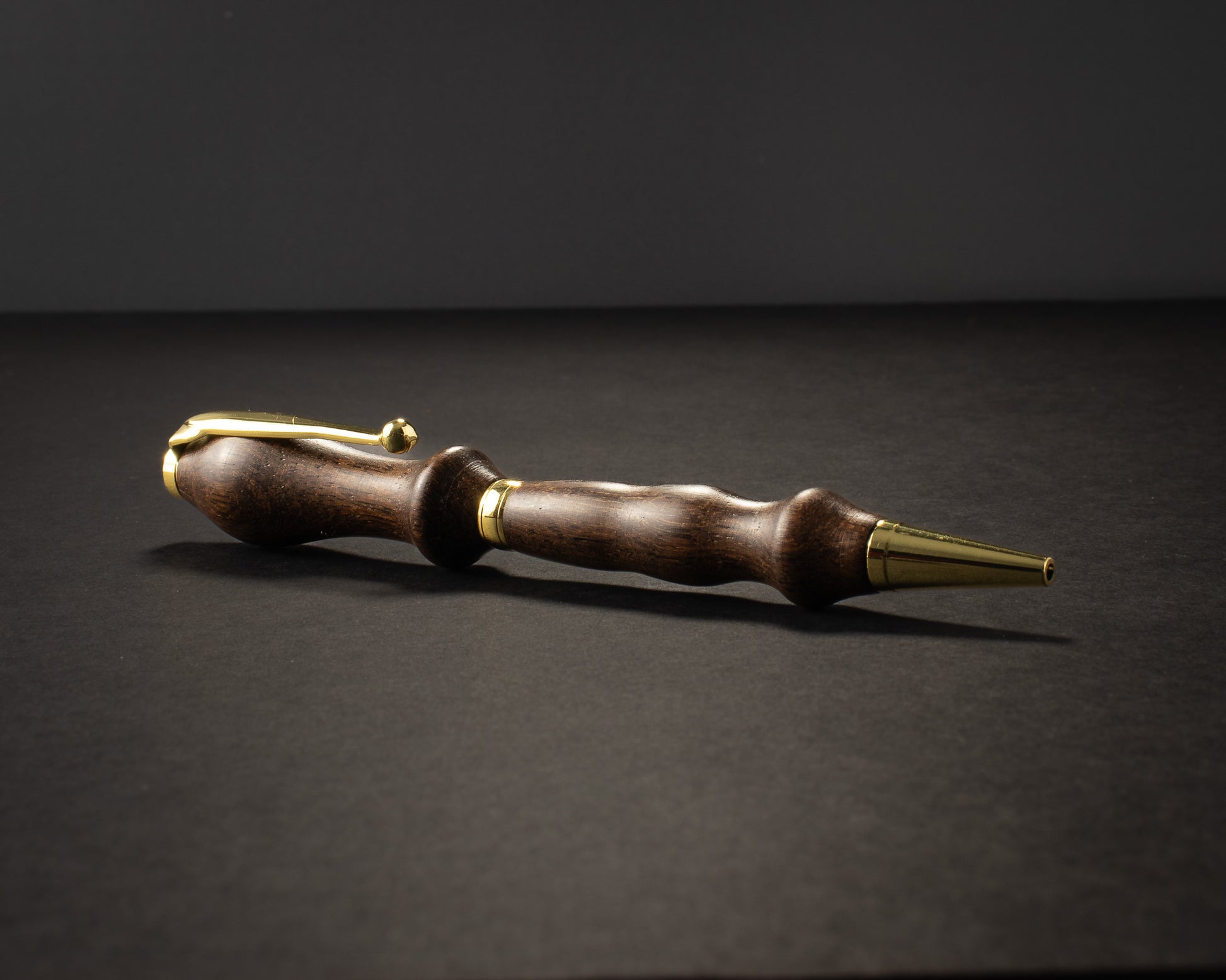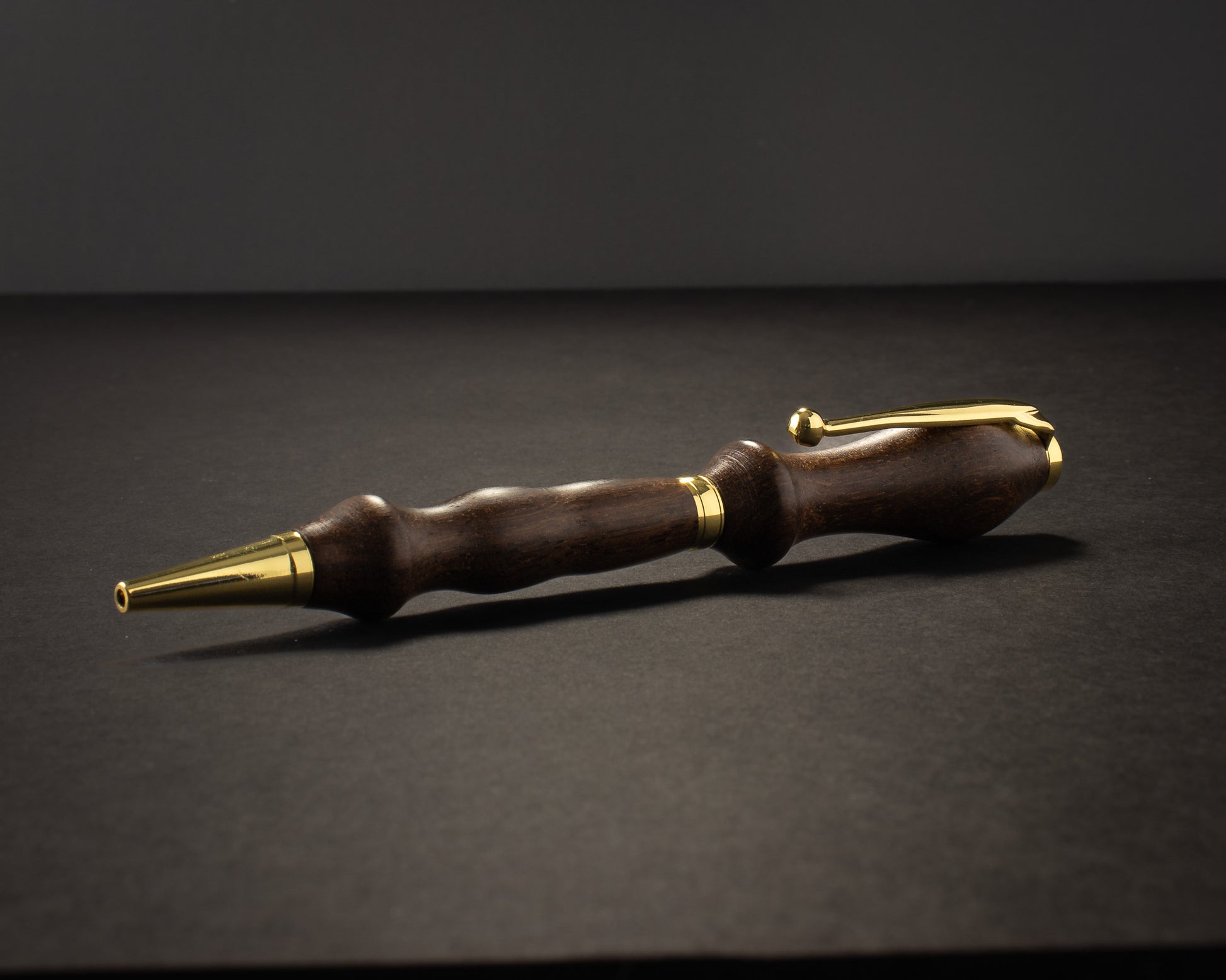 The Sovereign — Slimline, Gold Hardware is more than a pen; it is a tribute to timeless craftsmanship. Its stepped ornamental profile crowned with polished gold trim speaks of heritage and elegance. Crafted from rich dark hardwood and carefully turned to precision, this slender pen feels both sturdy and refined—designed not just to write but to become a cherished keepsake, carrying stories and moments through the years. With The Sovereign in hand, tradition is alive in every stroke.