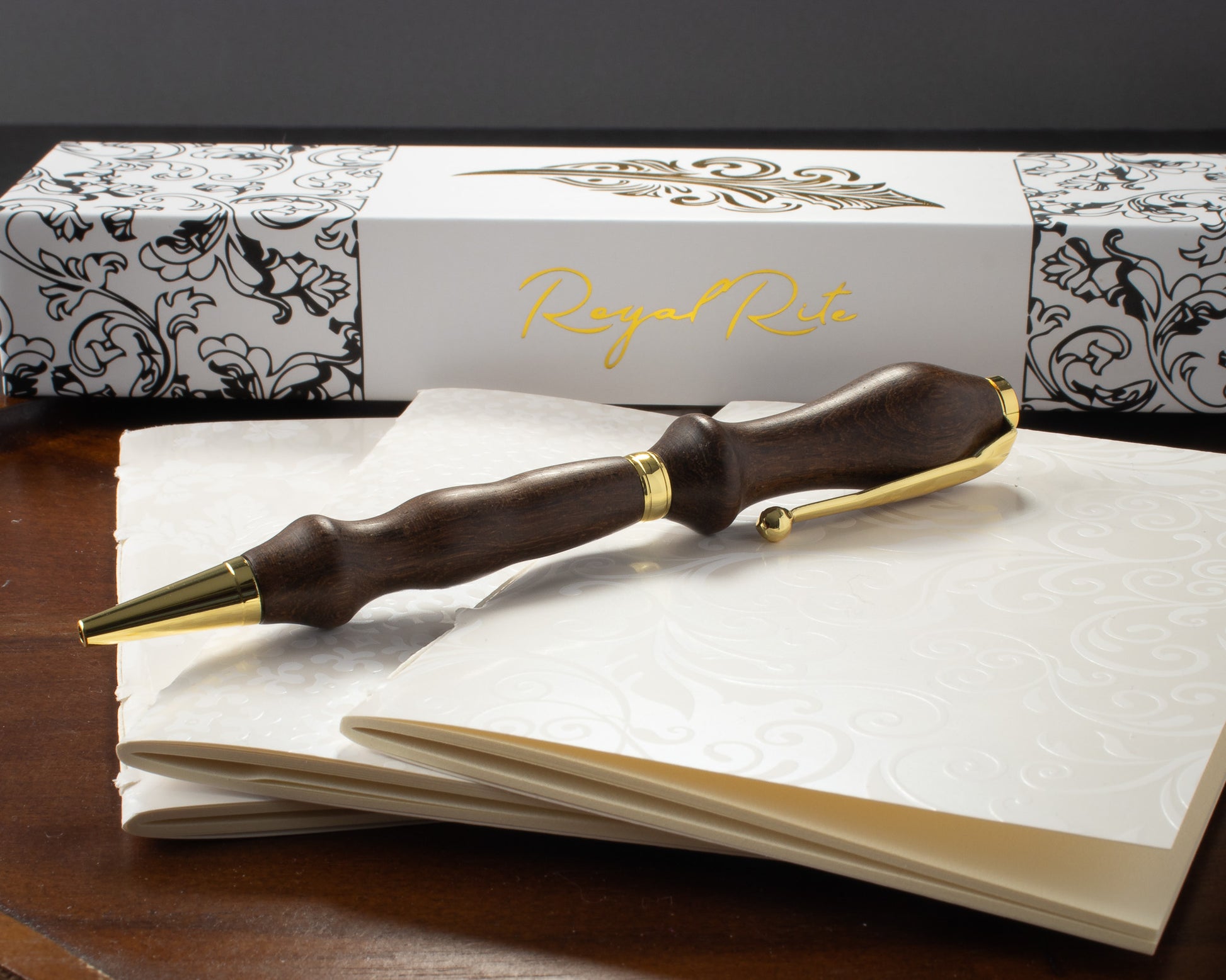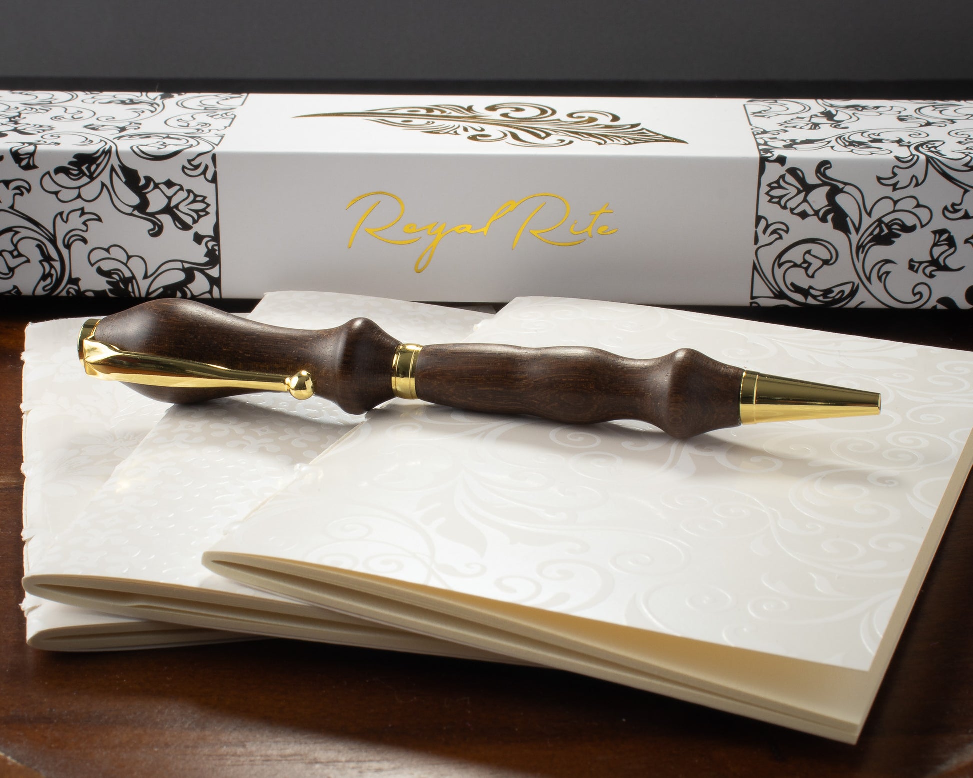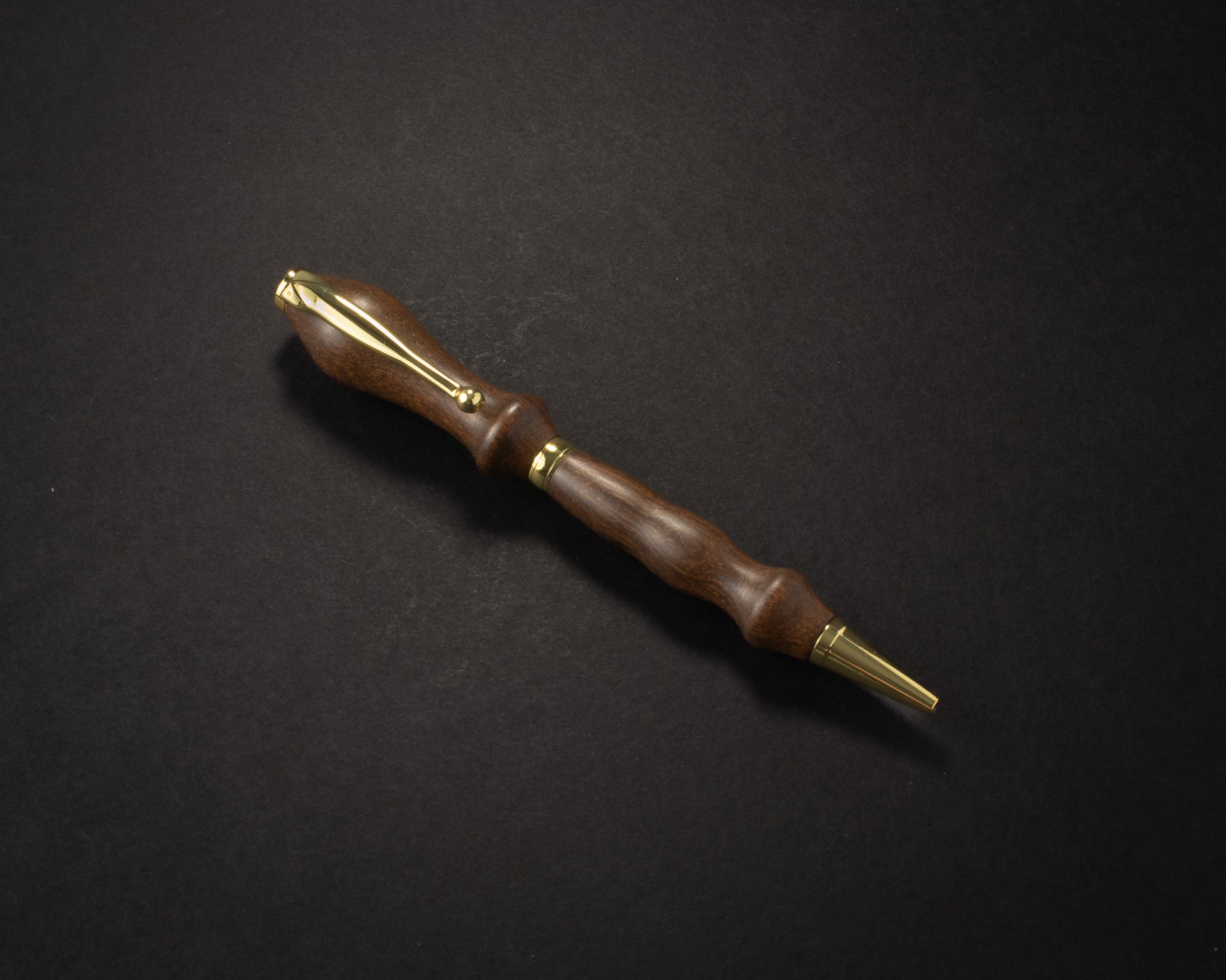 The Sovereign — Slimline, Gold Hardware is more than a pen; it is a tribute to timeless craftsmanship. Its stepped ornamental profile crowned with polished gold trim speaks of heritage and elegance. Crafted from rich dark hardwood and carefully turned to precision, this slender pen feels both sturdy and refined—designed not just to write but to become a cherished keepsake, carrying stories and moments through the years. With The Sovereign in hand, tradition is alive in every stroke.